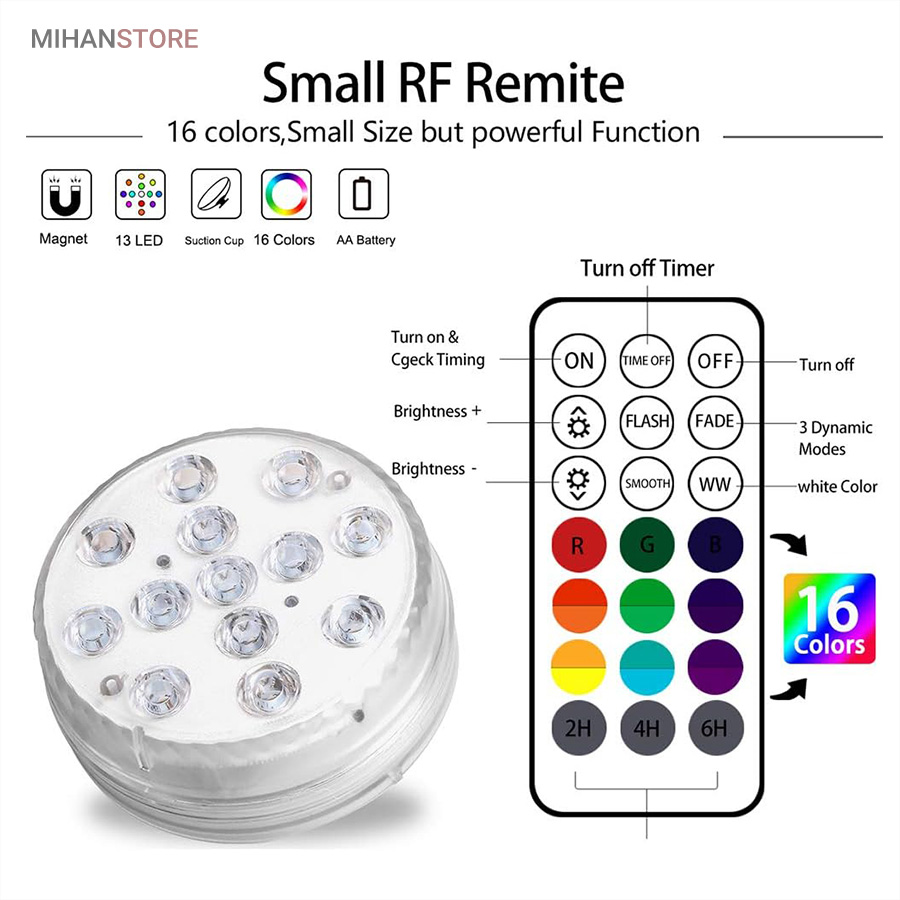 ایده آل برای استخر، وان حمام، حوض، فواره، آبشار، آکواریوم، گلدان، باغ، باغچه، عروسی، مهمانی و غیره. این محصول طراحی ضدآب بسیار قدرتمندی دارد، حلقه مهر و موم خارجی سیلیکاژل مقاوم در برابر حرارت دارای اثر ضد آب بهتری نسبت به سایر چراغ های استخر دارد، از ورود کامل آب جلوگیری می کند و عمر طولانی را تضمین می کند. نمای بیرونی ABS ضخیم شده، محافظت در برابر خوردگی و سفتی را نشان می دهد. دارای 16 رنگ، 5 سطح روشنایی، 3 حالت نور و 3 عملکرد تایمر (2 ساعت، 4 ساعت، 6 ساعت)، شما می توانید آن را به دلخواه تنظیم کنید.