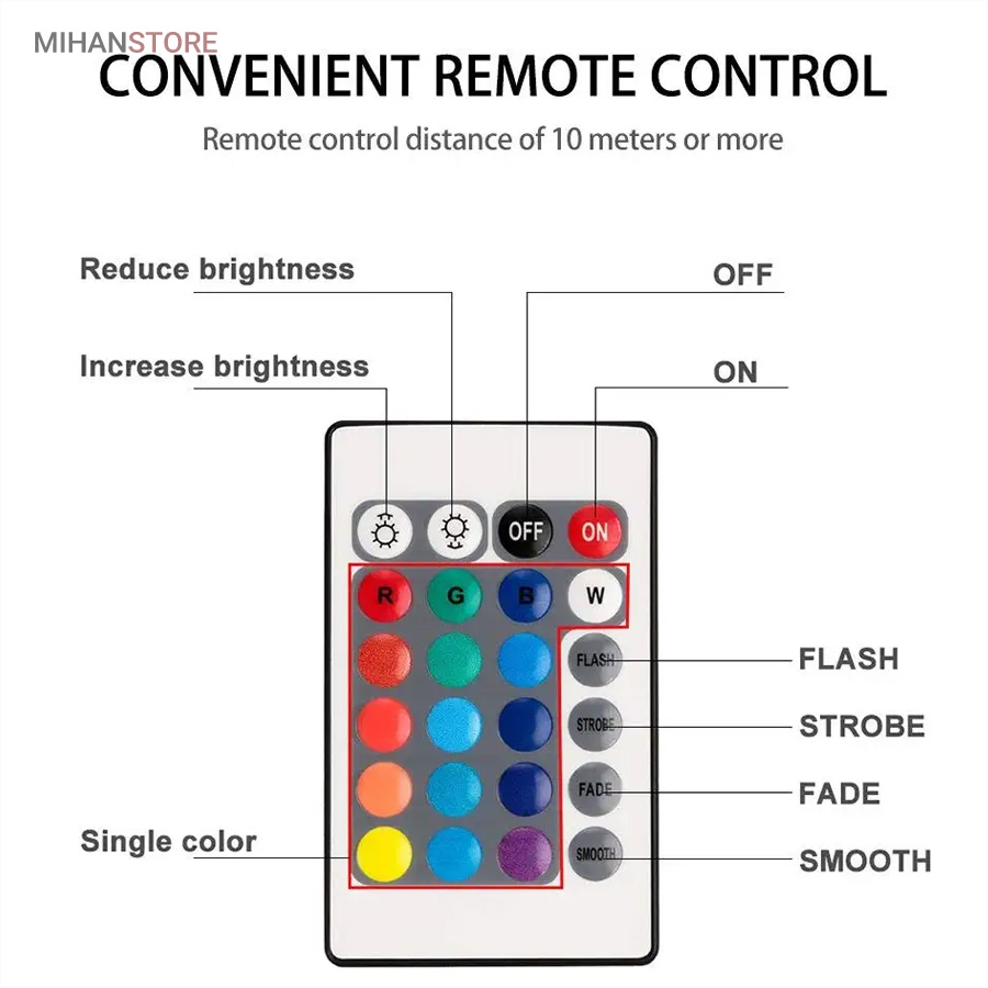 چراغ LED ریموت دار ضد آب کاربرد های بسیار گوناگونی را برای تغییر و زیباسازی دکوراسیون منزل و حیاط دارند که محیط زندگی شما را دوچندان زیبا میسازد. این چراغ های رنگی اندازه مناسبی دارند که برای پیداکردن باغ و تراس خانه شما ایده بسیار جدید و چشم گیری است. این چراغ ها همچنین ضد آب می باشند. ال ای دی مقاوم و دارای ریموت کنترل برای تنظیم نوردهی می باشد. پشت این محصول دارای چسب 2 طرفه بسیار قوی برای چسباندن چراغ می باشد.